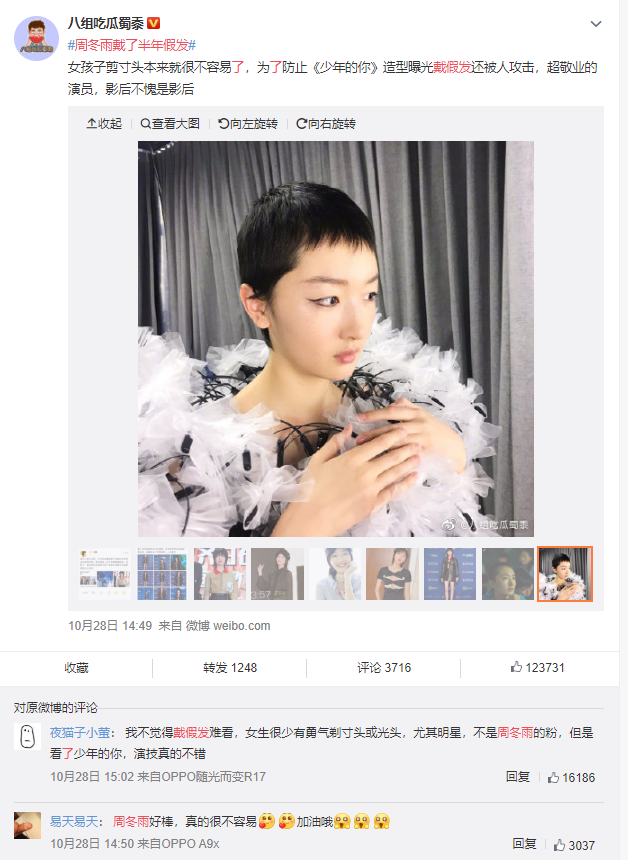 92年生的周冬雨演完全演出了高三学生的感觉,清澈又干净,作为一个女明星,为了剧情需要,甚至还剪了寸头,为避免造型提前曝光,又戴了半年假发。