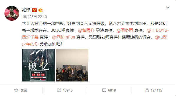 观看了首映场的演员张译对《少年的你》评价极高,甚至说这是自己今年最喜欢的一部电影。除了张译,这部电影和主演的表现力还得到了许多业内人士的认可。