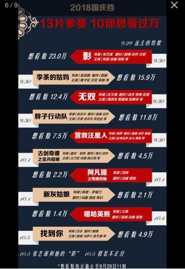 其中《影》《李茶的姑妈》《无双》《胖子行动队》《营救汪星人》都提前“抢跑”,选择在9月30日上映。