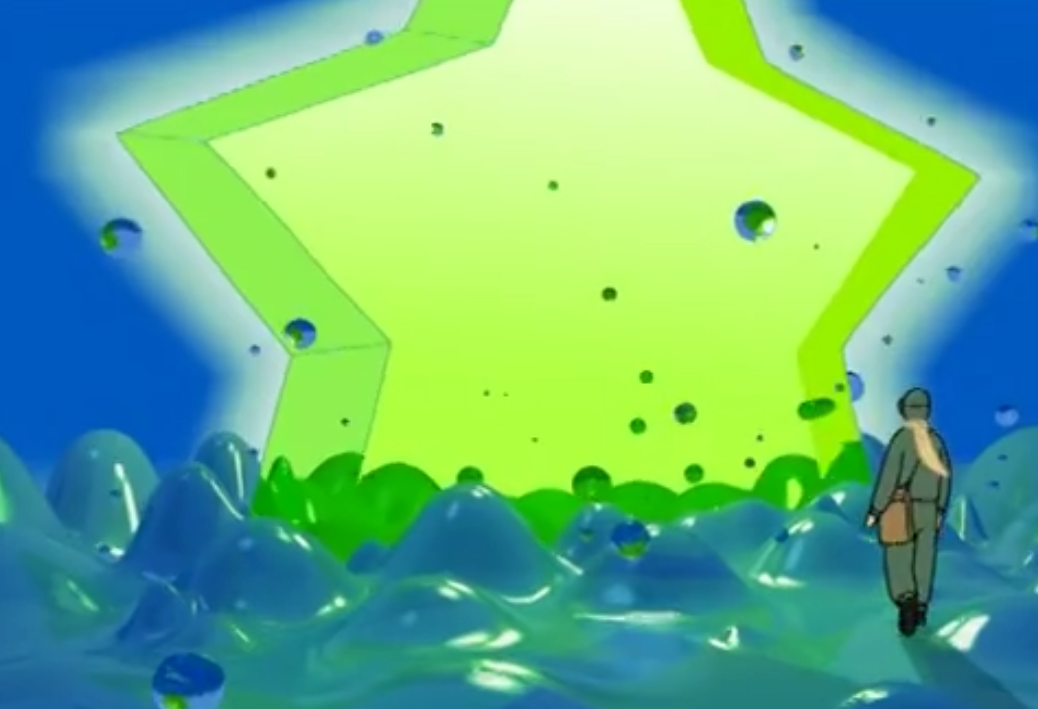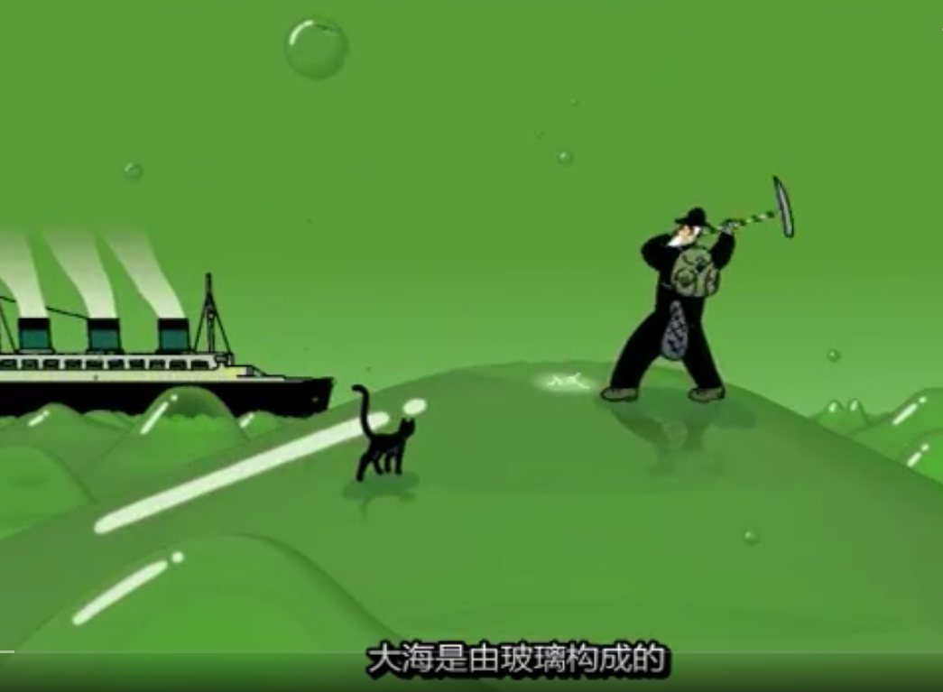 变成玻璃的海水不再是神秘的蓝色,而是晶莹剔透的绿色,甚至天空也与海水融为一体,在其创造的这个看似真实的世界中,营造出一种迷幻的情调。其实作者一开始就没有准备对客观世界进行再现,其有意识的在追求色彩的展现,但不考虑色彩处理的真实性,削弱了我们对于表象真实感的认知,最大程度的发挥了动画的优点,将我们带入到一个超现实幻境中。
