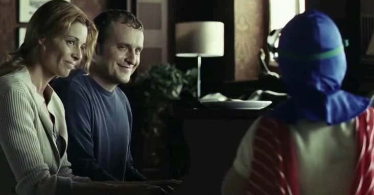 当小孩子们都来了的时候,劳拉在家里举办了宴会。她兴高采烈的上楼请西蒙去玩耍,可她到处都没有找到西蒙,反而看到了一个带着奇怪面罩的孩子,那个孩子一把将劳拉推进了洗漱间里,并把她锁在了里面。