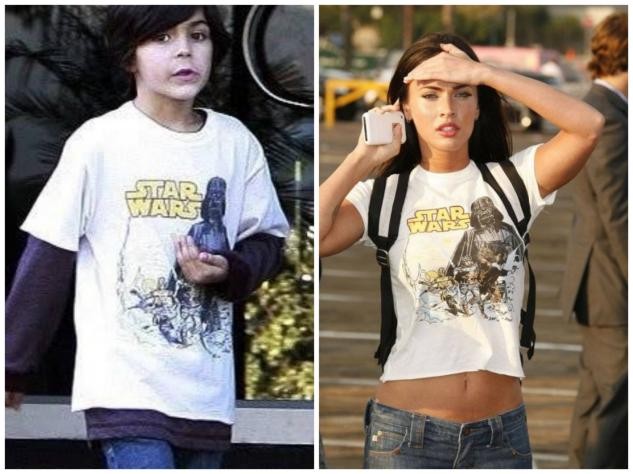 梅根?福克斯的穿衣风格一直都很多样,日前还有网友晒出了她儿子穿的衣服一样,只见梅根的儿子身穿白色短袖很宽松,而梅根身穿这件短袖却看着很小,还露着肚脐,看起来很性感,但她这个举动还被网友调侃了很长时间。