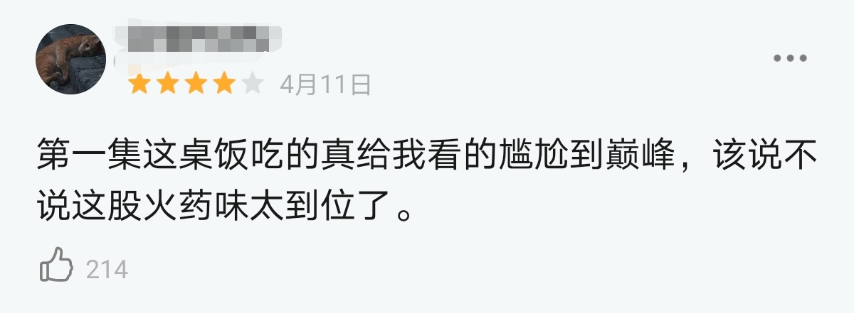 “第一集这桌饭吃得真给我看得尴尬到顶峰,这股火药味太到位了”