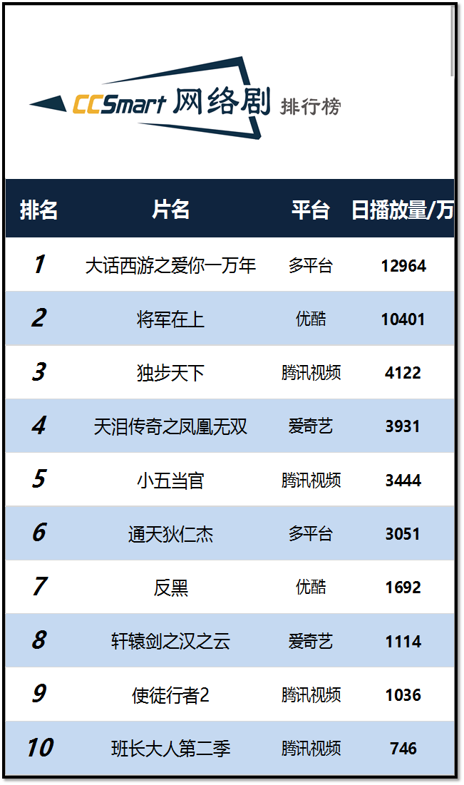 昨日《大话西游之爱你一万年》和《将军在上》的播放量依旧是遥遥领先,同时破亿。《将军在上》自10月25日开播以来,播放热度持续升温火爆荧屏,上线不到24小时播放量便破亿,此外,更是持续获得第二的位次,日播放量均在一亿左右。开播不到一周便有如此好成绩,期待这部剧集有更好的表现。