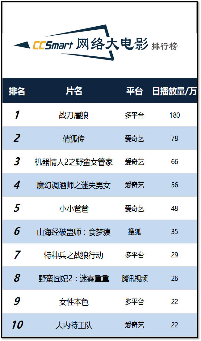 前日新上榜的影片《机器情人2之野蛮女管家》和《女性本色》播放量均有所上涨,分别以66万和22万的播放量排在榜单第三、九位。