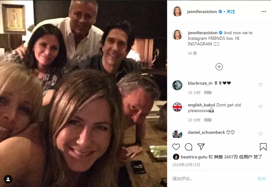 2019年10月15日,安妮斯顿入驻instagram,发布了一张她和《老友记》其他五位主演的合影,点赞数超过1600万,instagram平台服务器一度因此瘫痪,也创造了“在社媒上最快获得100万粉丝”的吉尼斯世界纪录:5小时16分。