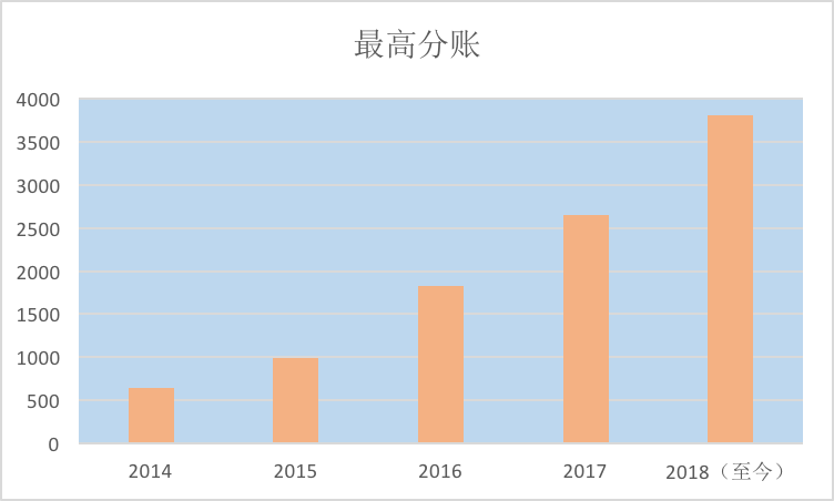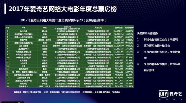 2014年,爱奇艺全年产生的最高分账为645万;2015年,最高分账为988万;到2017年,最高分账数字增长到2655万;2018年,根据爱奇艺世界大会上刚刚公布的数据,网络电影的最高分账属于《灵魂摆渡黄泉》,其单片分账收入已经超过3800万,在整个付费期预计分账收入超过4000万。