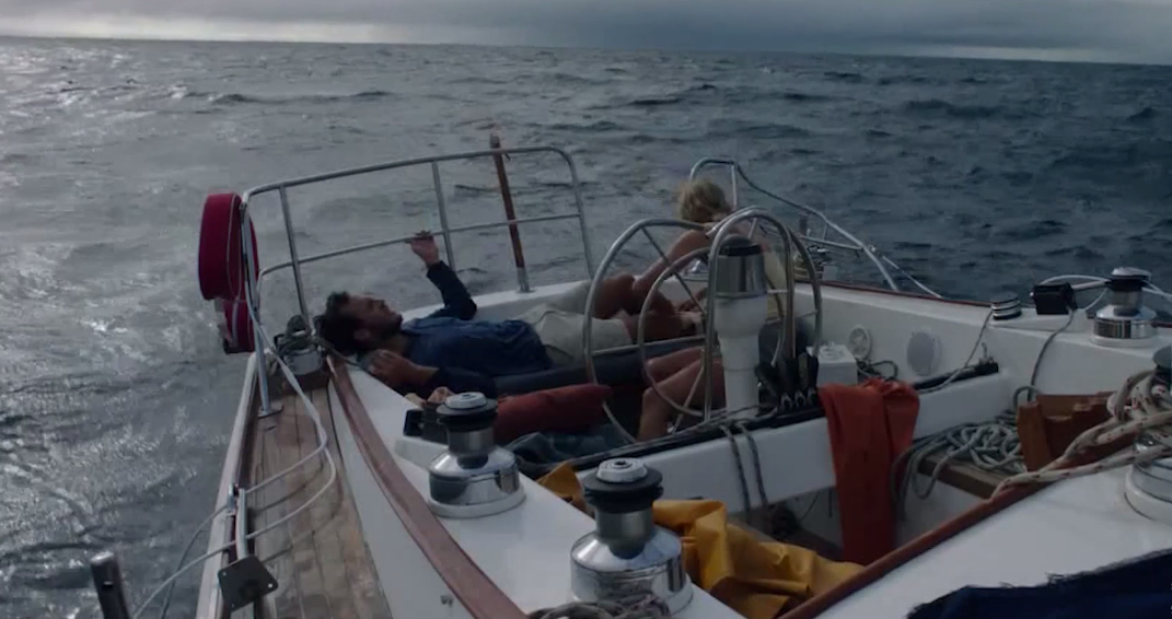 他们就这么驾着船横渡太平洋,在海上的夕阳下讨论莫奈的画作,到了夜晚伴随着海风他们用老旧的吉他弹奏歌曲。就在如此浪漫的海天相接中,塔米接受了理查德的求婚,随后一路飘一路浪,仿佛整个世界只有他们俩,如胶似漆。在海上行驶了三周后,猝不及防到来的雷蒙德打破了他们的甜蜜生活,这雷蒙德不是别人,是四级飓风,也是太平洋史上有记载的最强飓风之一,一个巨大的海浪就将他们的爱情小船掀翻了。