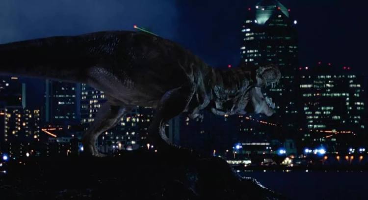 运输船抵达港口,霸王龙挣脱牢笼,在人类市区大肆破坏。