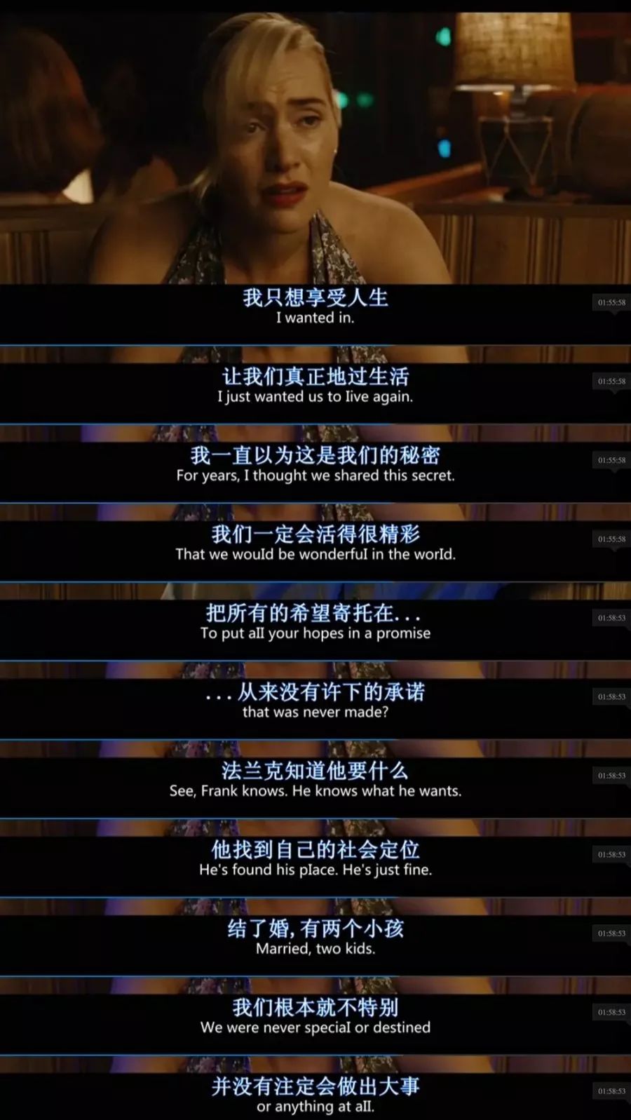 最爱的一个片段是电影从70分开始,april在酒吧抽着烟流着泪的独白,而后起身跳舞,音乐有多欢乐,人就有多绝望。这个拐点之后,泰勒夫妇的生活失去色彩。