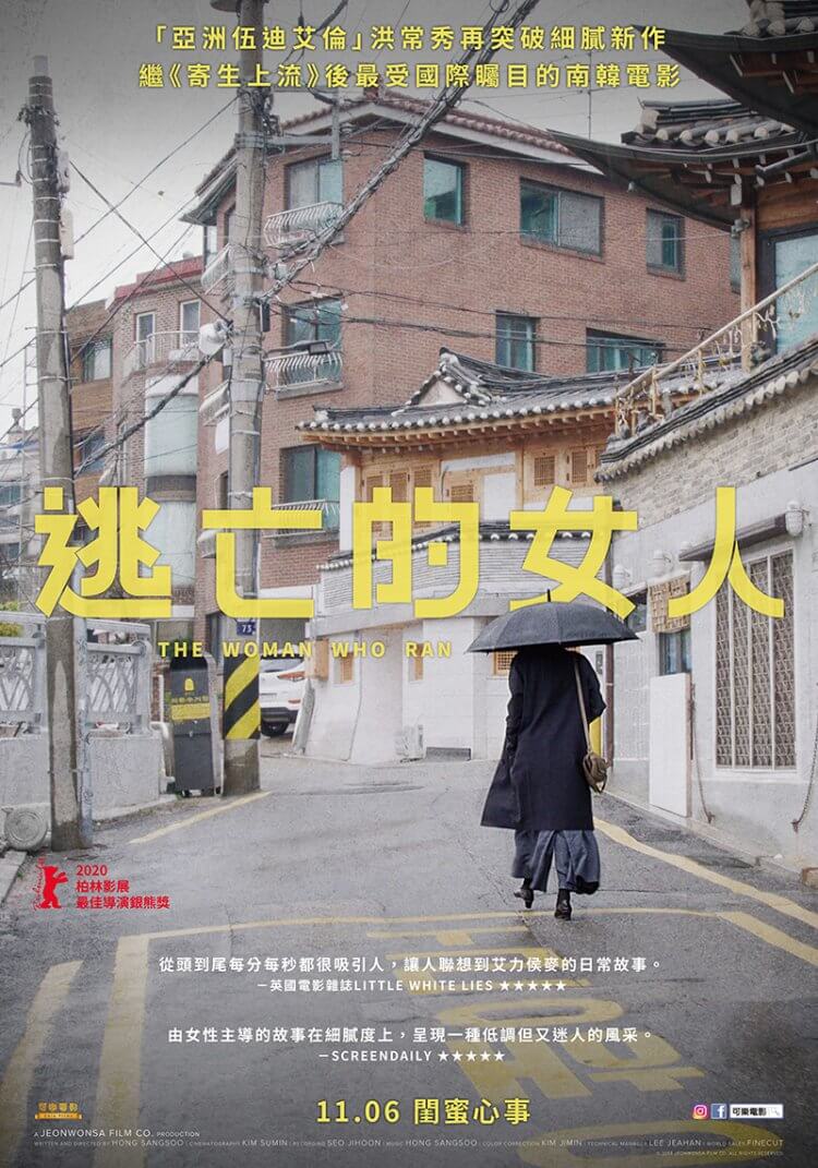 洪常秀在生涯四度入围柏林影展后,首次凭《逃亡的女人》夺下 2020 柏林影展最佳导演银熊奖殊荣。除了柏林影后金珉禧作为穿针引线的主角外,还有固定班底《草叶集》徐永嬅、《江边旅馆》宋善美、《我们与爱的距离》金玺碧、《屍速列车:感染半岛》权海骁等,一改过往作品中总爱描绘长篇大论又与年轻女子暧昧不明的男性们,电影聚焦在女子们”午茶闲聊“式的流言耳语,另类精准描绘出擅长的两性母题。