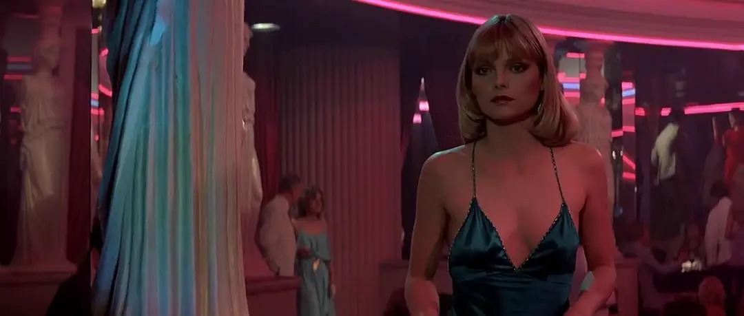 "米歇尔·菲佛 《疤面煞星》拍摄了一个想要赢得全世界的男人,而且我们甚至一度看到固特异(goodyear)飞艇上“世界是你的”的标语在向他闪烁着。他的这个世界,包括占有一位合他意的女性,自从他见到亭亭玉立的金发女郎埃尔薇拉(elvira,米歇尔·菲佛[michelle pfeiffer]饰)那一刻起,他就决意必须拥有她。她是弗兰克的情妇,但很快弗兰克就死了,他的情妇和生意都归托尼所有。这样毫无疑问她已然归他所有了,但是他所期待的和她一起开始的新生活则完全事与愿违。他们之间并没有爱情,也无欢愉。在有他们俩的两个场景中——一个是在泳池中,另一个是在一个巨大的浴缸中——她的乏味厌倦是显而易见的。她终日与毒品为伴。托尼对他的妹妹吉娜(gina,玛丽·伊丽莎白·马斯特兰托尼奥[mary elizabeth mastrantonio]饰)更感兴趣。尽管乱伦的欲望扭曲了他的人格,使得他不允许任何其他男人靠近她。这还导致他最后杀了他最好的朋友马诺洛(斯蒂文·鲍尔[steven bauer]饰)。吉娜对他嫉妒心的反应是如此惊人地直接(“这就是你所想要的吗,托尼?”),这表明她完全明白他是什么样的人,也明白她能采取什么样的行动。