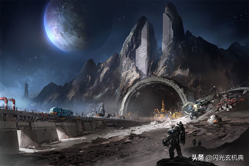 远方巨大的星球不会再是本体星球的一个卫星星球,看上去他们之间的“潮汐关系”也许比较明显。插图中巨大的隧道和外面的工地看上去在刨挖着什么,也许是能源也许是不可思议的其他物体或者平行世界中的不可思议。