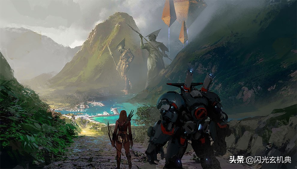 不清楚这个建筑的存在意义,是因为历史上的一种不得而知的信仰还是被另一种文明所占领之后的遗迹,外观看很是宏大和壮观。不知道此时此刻画面中是否还有它曾经的辉煌或者仍旧留存着它的神奇故事。女体机甲站立的位置不清楚是为了巡视时的姿态还是另有威慑的一种姿态。
