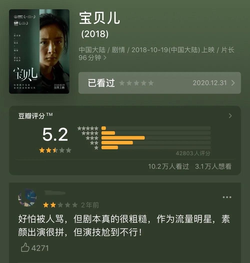 其中最为有代表性的堪属杨幂,在电影《宝贝儿》中,方言+素颜的演出一开始让大家期待颇高,可最后豆瓣5.2的评分却又狠狠打了大家的脸。