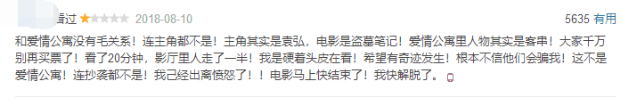 和爱情公寓没有毛关系!连主角都不是!主角其实是袁弘,电影是盗墓笔记!爱情公寓里人物其实是客串!大家千万别再买票了!看了20分钟,影厅里人走了一半!我是硬着头皮在看!希望有奇迹发生!根本不信他们会骗我!这不是爱情公寓!连抄袭都不是!我己经出离愤怒了!!电影马上快结束了!我快解脱了。