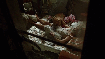 对于人物不同的场景、不同的情绪,运用了多层次的画面质感与色调。比如斗狗的场面用了阴冷的绿色,表现人物的家庭生活时用了较为温馨的暖黄色。最特别的是拉米罗抢劫商店回家以后,这段用的是强烈的红色光影,表达了他与妻子愉悦、炙热的情绪。第一个章节和第三个章节画面质感粗粝,第二个章节构图精致、柔和,表现了不同阶级的生活状态。