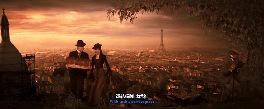 影片开头灰暗、昏黄的怀旧色调,将视点聚焦于1900年的巴黎蒙马特村,纸醉金迷、灯红酒绿、莺歌燕舞、物欲横流的“红磨坊”。在这里,既有附庸风雅的贵族,也有随处可见的穷困潦倒的漂泊者。打破常规的构图、应接不暇的特效、凌乱无序的景别,制造出一种绚烂满目的效果,一副喧闹、浮华的巴黎图景浪漫又梦幻。高反差的色彩是影片重要的表意元素,例如,象征着欲望与罪恶的红色,忧郁冷峻的蓝色,末世梦魇般的灰黄。