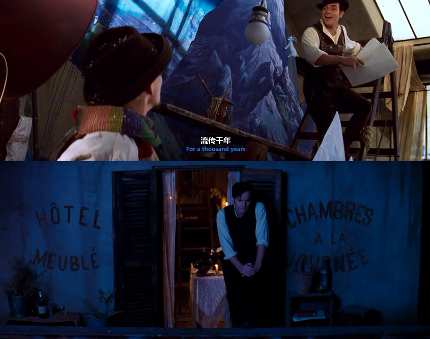 《红磨坊》的故事仍旧是基于一个无关文化背景、语言环境的全人类普遍困境,即是在拜金主义、功利主义、享乐主义盛行之下理想之殇,对爱情的坚守、对艺术的初心、对梦想的执着,在现实中不断妥协与消解,在人生理想与现实中不断调和。而本片中的舞女萨汀与青年诗人克里斯蒂安的爱情悲剧正是这一主题最通俗化的形式,而在前些年的《爱乐之城》中,男女主角之间的爱情也仍旧不脱离这种母版。