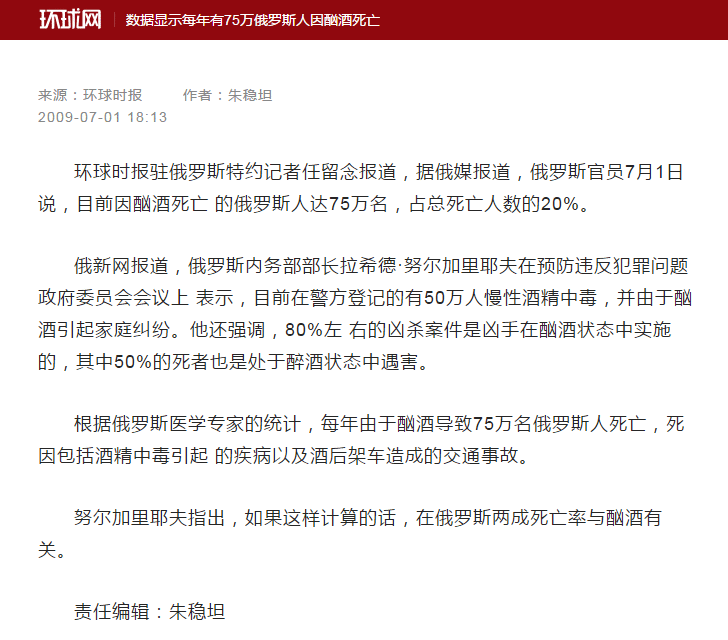环球时报驻俄罗斯特约记者任留念报道,据俄媒报道,俄罗斯官员7月1日说,目前因酗酒死亡 的俄罗斯人达75万名,占总死亡人数的20%。