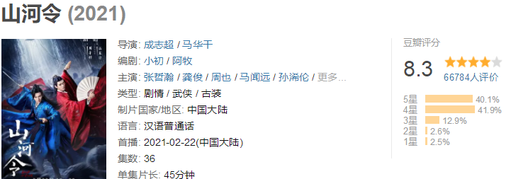 在豆瓣平台,《山河令》开分就拿到了8.2分,而且评分呈上升趋势,当日便冲上了8.3分。