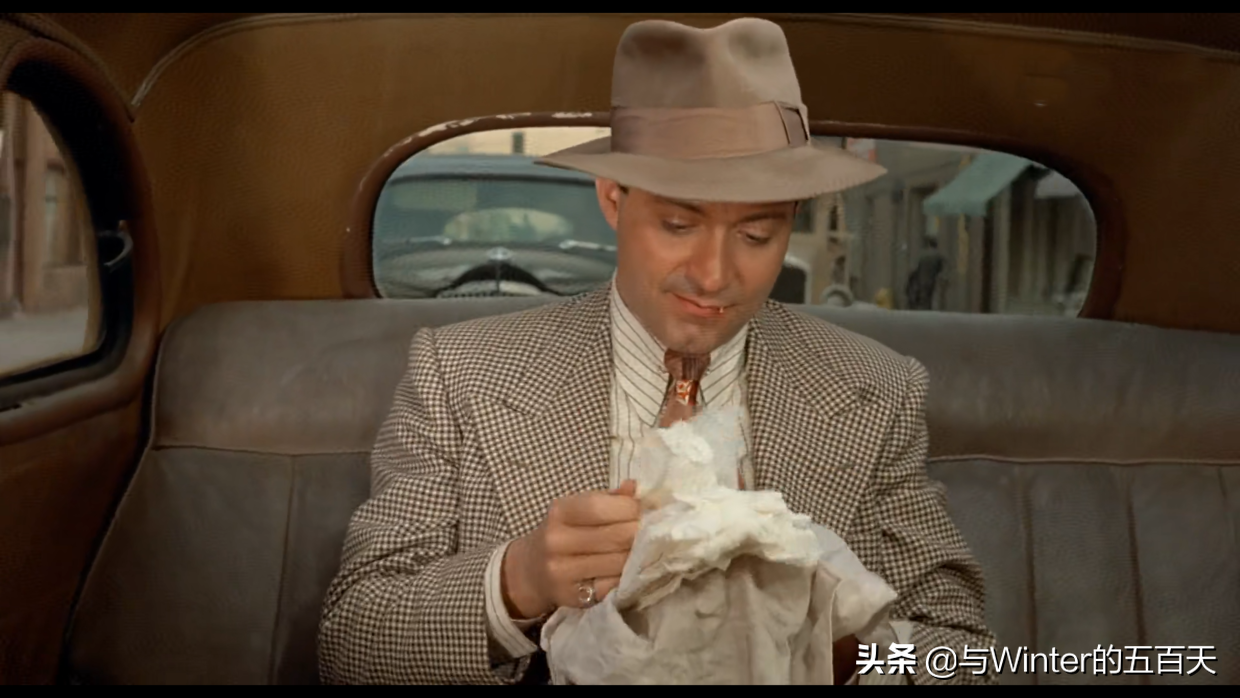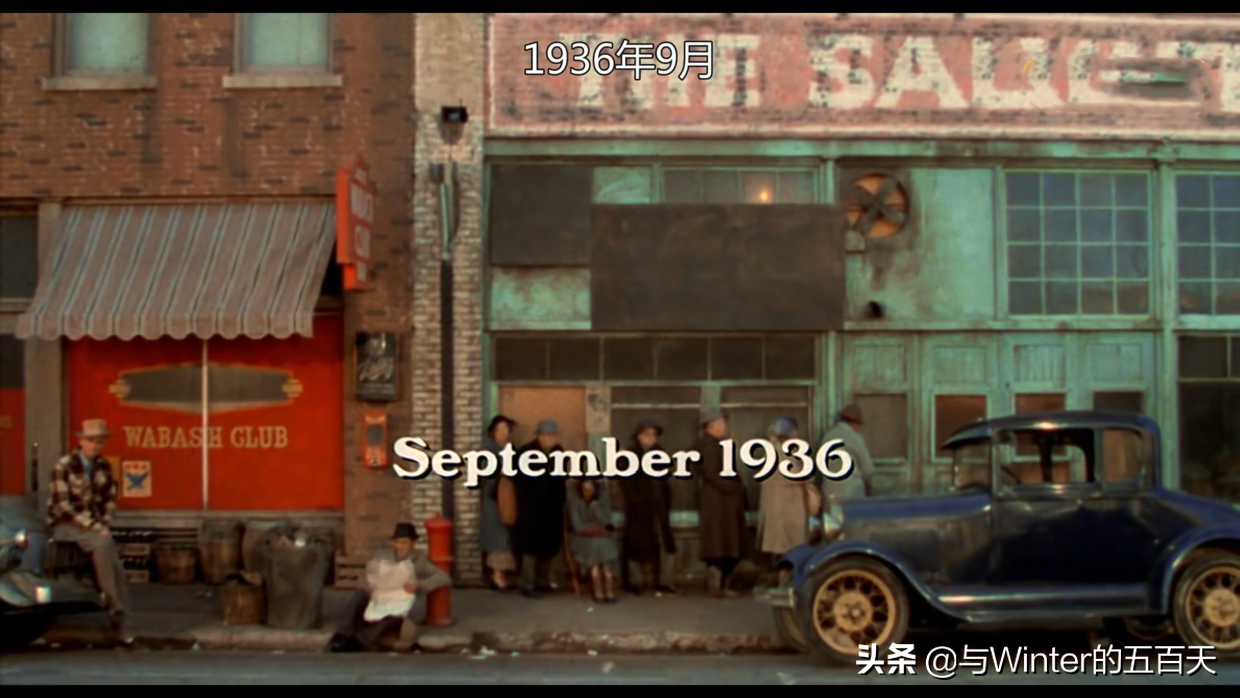 比如在电影的开头里,时间是在上个世纪的三十世纪(1936年),美国正值大萧条时期,银行倒闭,商店关门,毫无生机,萧瑟的马路上,人们无所事事,然后镜头左移的过程中,一个穿着皮鞋,西装革履的男人快步走入镜头,镜头跟着这位偶然闯入的路人,直到他走入一间房子才停止。