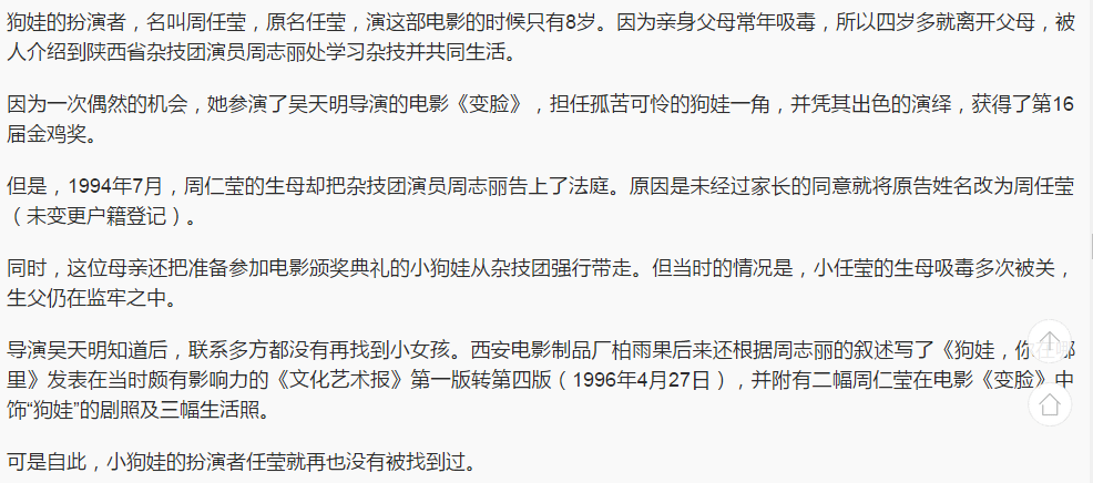 电影中的小女孩“狗娃”身世坎坷:“我让人卖过七回了。都嫌我是女的,拿我当牲口。”影片外“狗娃”的扮演者周任莹,其遭遇也如出一辙。