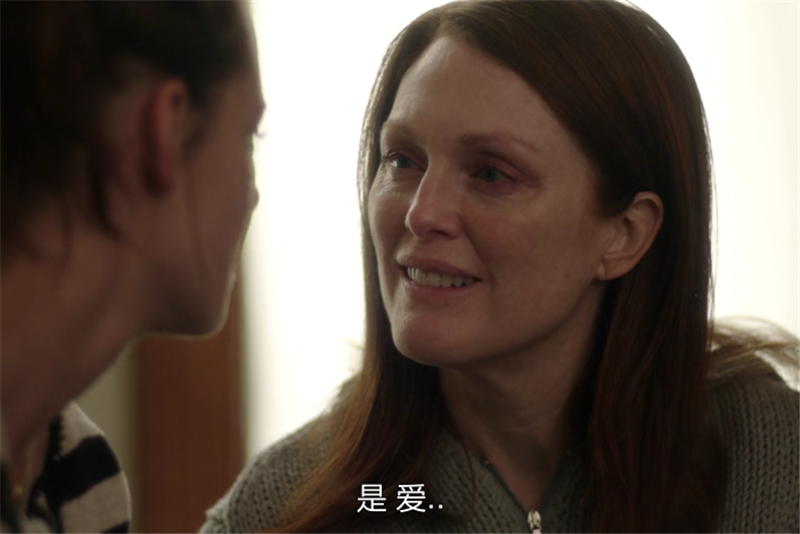 电影的最后给了观众答案,爱丽丝的小女儿读了一段《天使在美国》里的对白,她问爱丽丝,“我刚刚读了什么”。逐渐失去语言能力的爱丽丝,含糊不清的重复着一个单词,“love。”