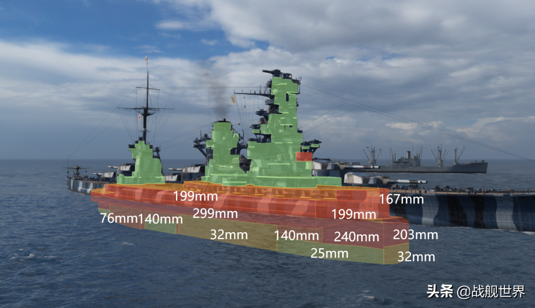 血量充足的同时,螯(日向)还拥有相当不错的装甲结构。26mm的头尾就不多说了,侧面32mm超大面积防雷带对于敌方来说就一堵叹息之墙,无论是直接免疫Ⅷ级以下轻巡的he炮弹,还是摆角度弹飞大口径ap都相当好用。另外她149mm上装配合前半部分中段的35mm甲板,构成了第二个碎弹区域,进一步增强螯(日向)对he弹的直伤抗性。更可怕的是她的后半段甲板厚度高达44mm,令不少同级战列都黯然失色。