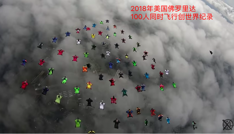 而且,翼装飞行者甚至能在空中玩出更多花样,现在已经有集体伴飞,空中牵手、组队,凹出有趣的造型等。比如,2018年在美国佛罗里达100人同时飞行创下了世界纪录。
