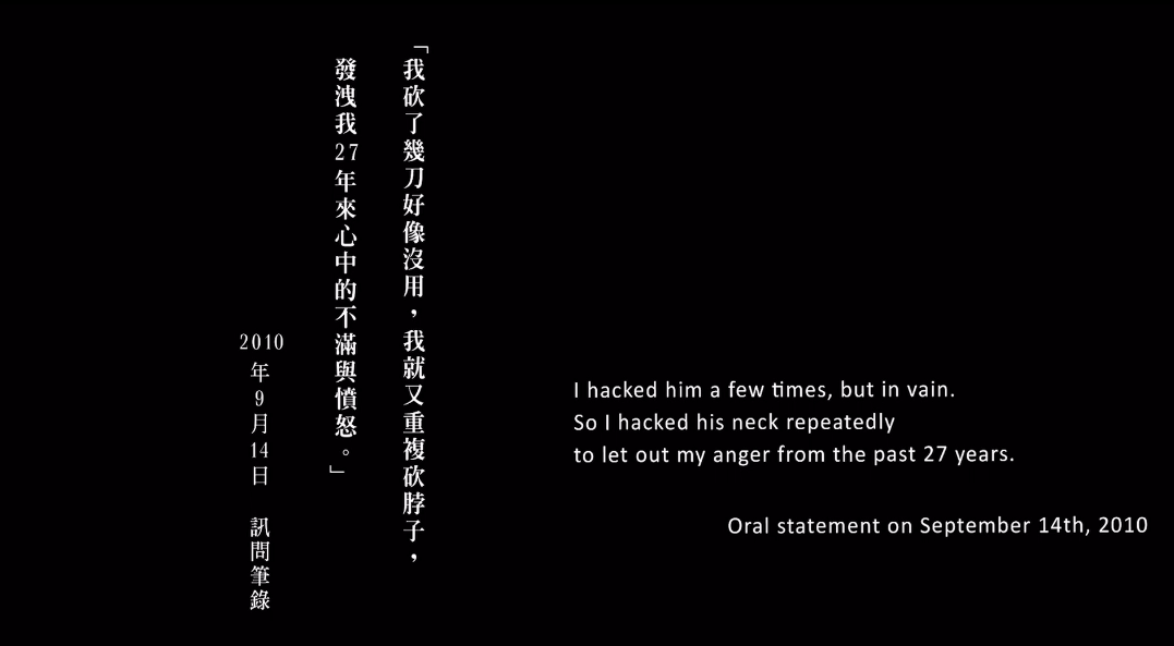 答:是我亲爱的父亲。我砍了几刀好像没用,我就又重复砍脖子,发泄我27年来心中的不满与愤怒。