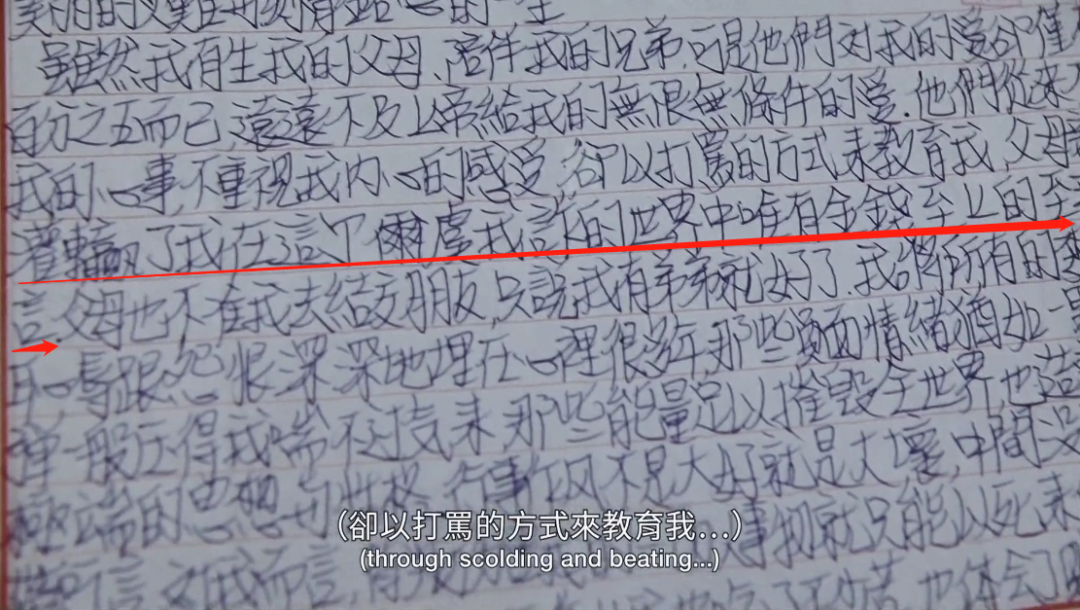 “虽然我有生我的父母,可他们从来不听我的心事,不重视我的内心感受,却以打骂的方式来教育我。灌输了我在这个尔虞我诈的世界中唯有金钱至上的至理名言。对我而言,背叛伤害我的一切人事物,就只能以死来偿还。”