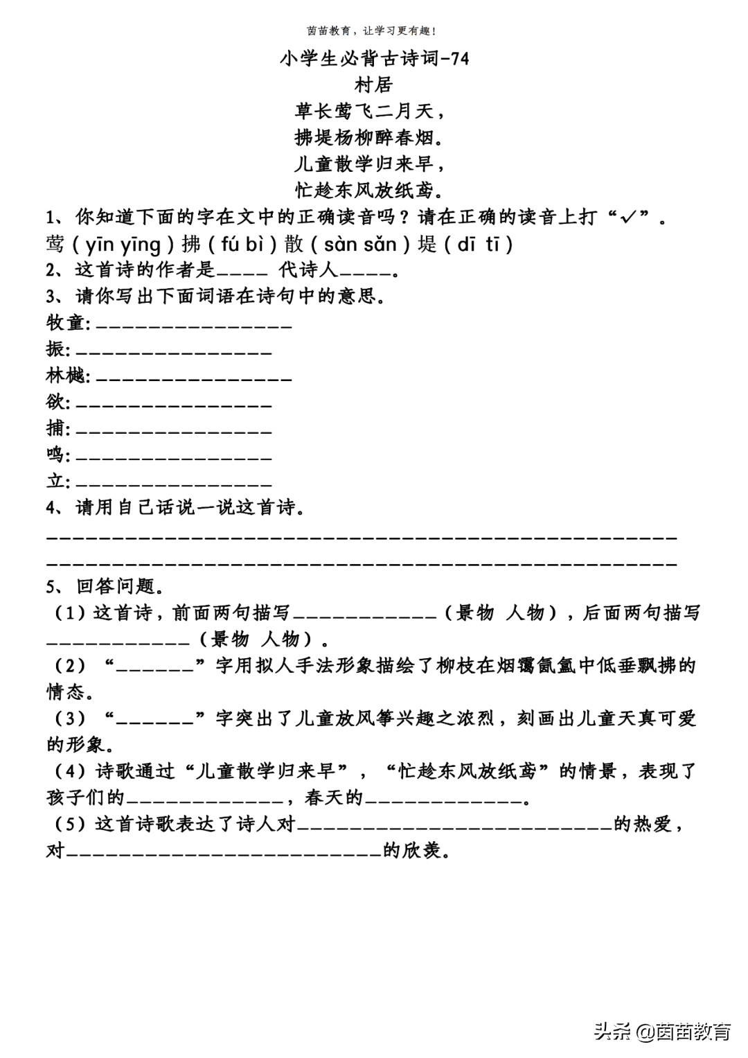 (5)这首诗歌表达了诗人对乡村春天美景的热爱,对儿童天真快乐生活的欣羡。