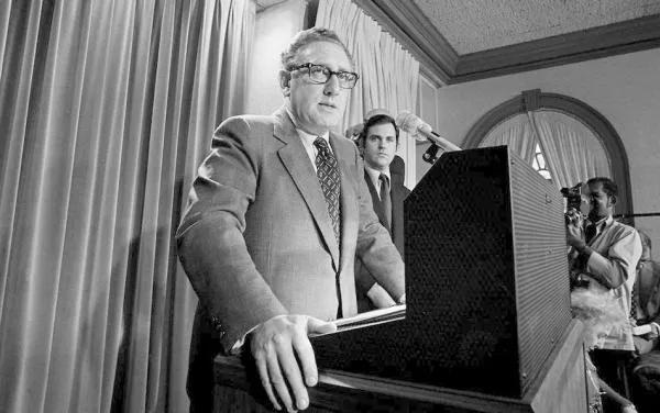 ▲1972年10月26日,美国国家安全顾问亨利基辛格在白宫新闻发布会中宣称越南“和平在即”。