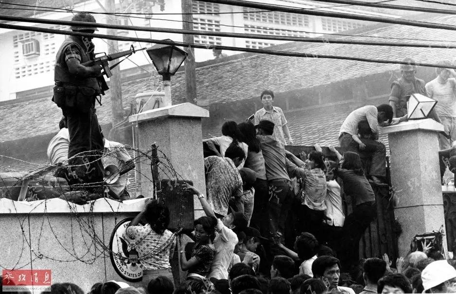 用于撤离的两个核心区域之一美国大使馆院区,成为想要逃离祖国的越南人最后的救命稻草,成千上万渴望搭乘美国直升机逃离的越南人将大使馆包围。