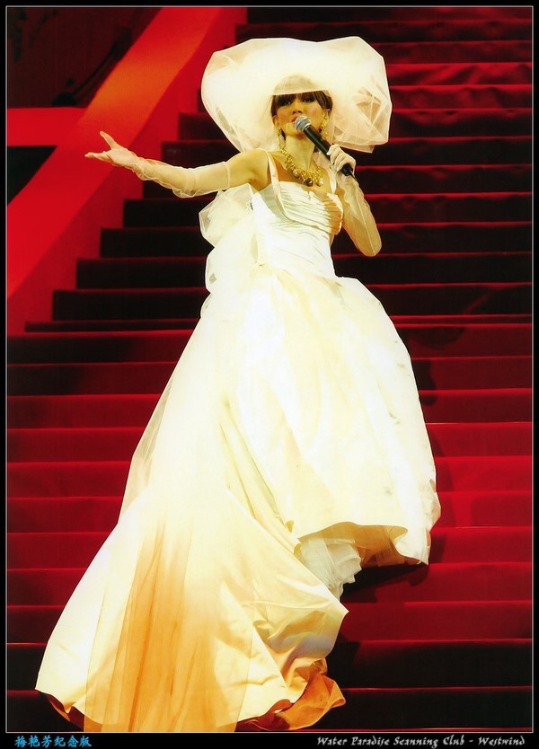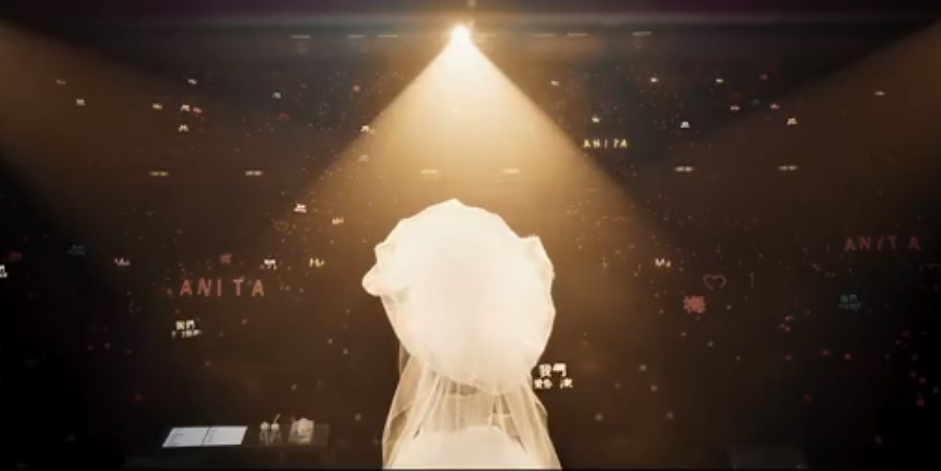 梅艳芳一身婚纱,面向观众,观众席上的应援幅清晰可见。