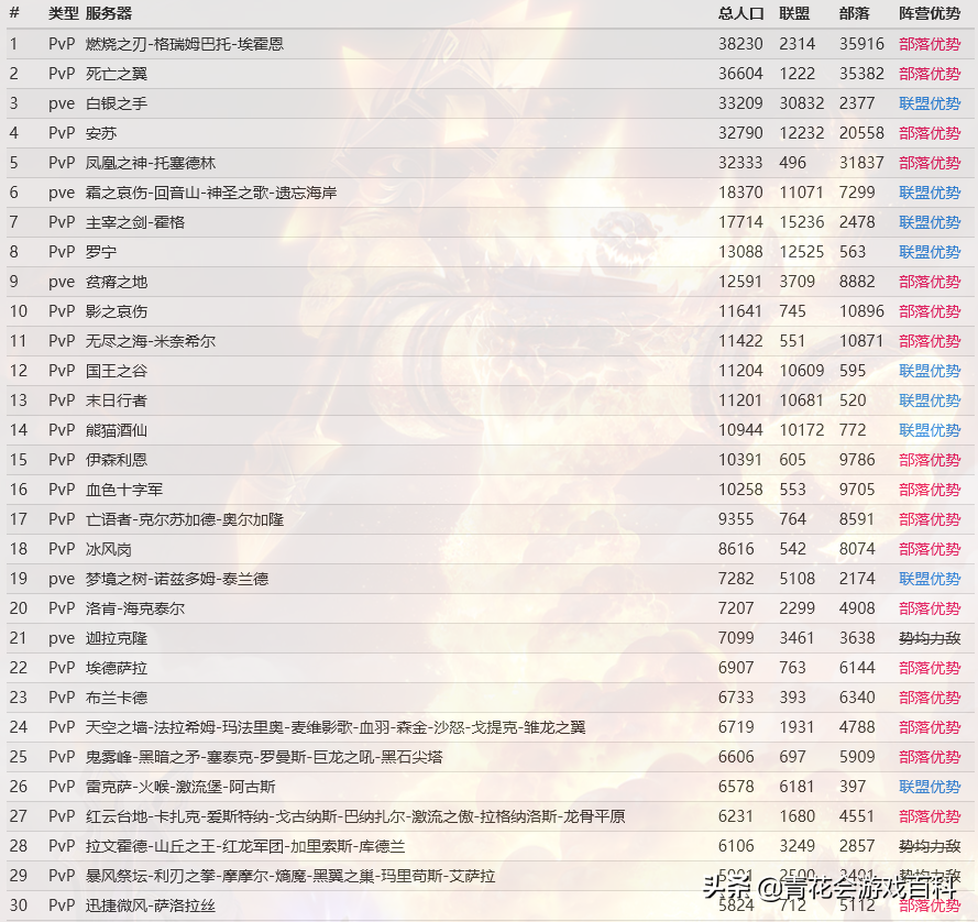 另外从2020年11月6号开始,《魔兽世界》将会免费向所有玩家开放3天,各位也可以趁这几天多体验一点内容,如果这款游戏对你胃口的话,那么不妨找个人数尚可的服务器常驻下来,比如下图中的这些(数据在1月份之后就没有再做更新了,所以仅供参考):