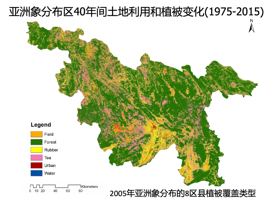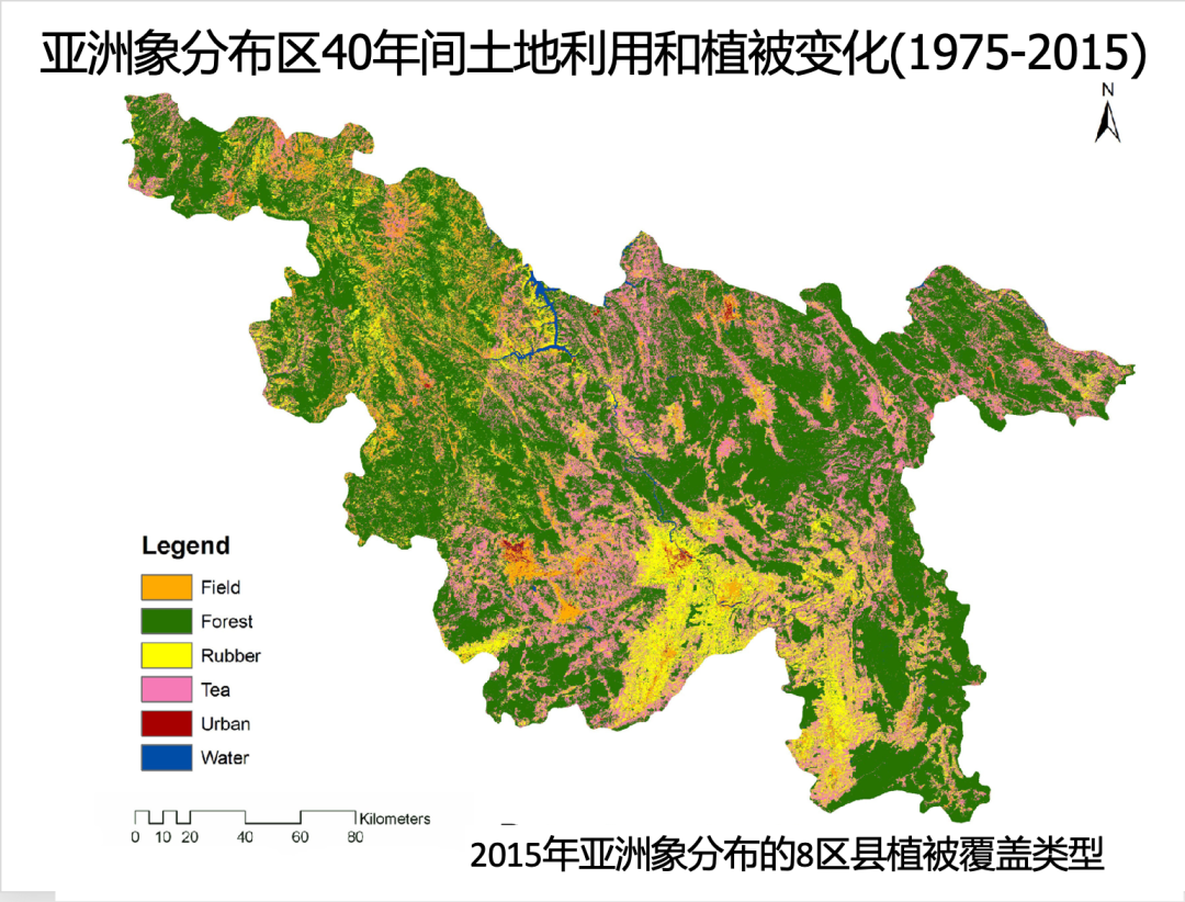 张立:1975年遥感卫星片显示,深黄色的部分都是农田。到了1990年,我们引进了橡胶,橡胶的价格不断上升,导致大部分人都开始想种橡胶,所以黄色区域就出现了。再到2005年,粉色区域出现了,这些地方种的是茶。到2015年,大面积种植茶已经连成了片。与此同时伴随着的,就是森林资源的大量消失,特别是天然林的消失。天然林不仅是亚洲象的主要栖息地,也是很多物种的栖息地。