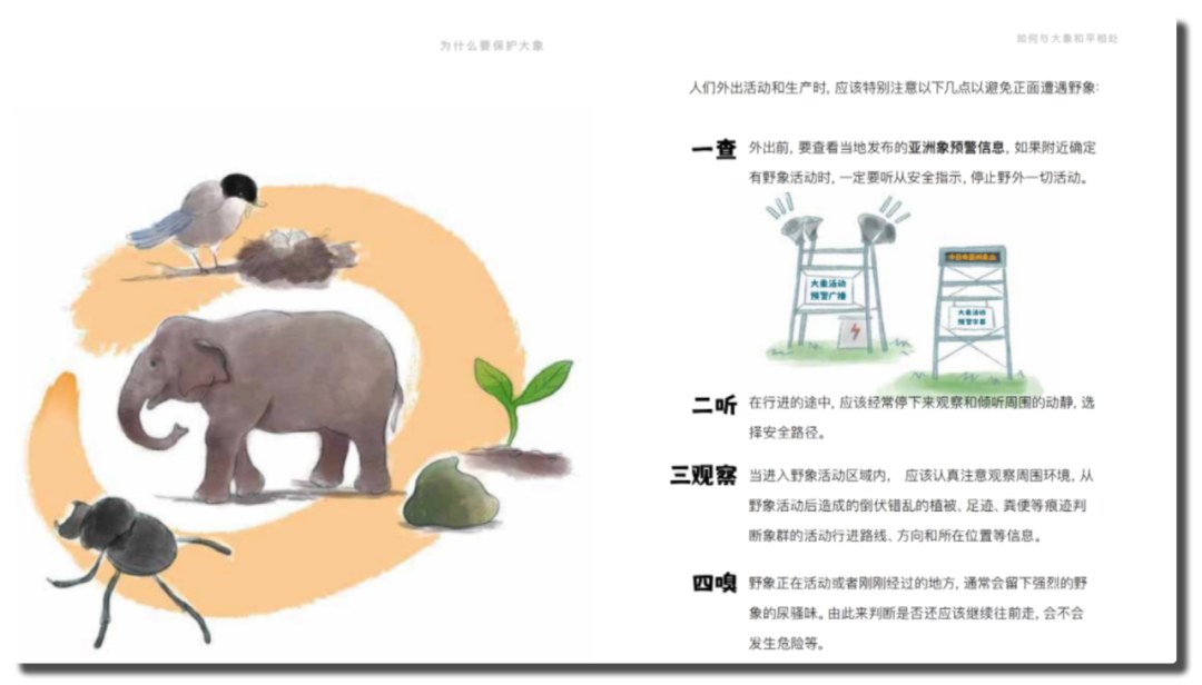 张立:阿拉善see西南项目中心,在云南做了一个诺亚方舟项目。通过保护野生动物的栖息地来保护这些物种,保护生物多样性。我们也做了很多社会工作,比如我们把科研成果转化为科普读物,让小学生能够了解大象。再通过他们告诉自己的父母,遇到大象的时候不要去追,不要去围观。