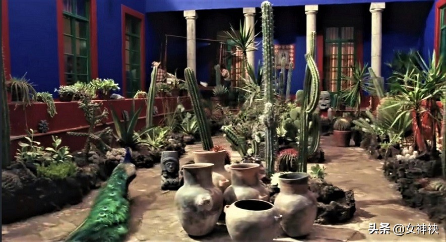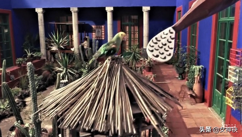 第一个镜头从满是仙人掌的蓝色庭院花园的鹦鹉,摇到地面上一只闲庭散步的孔雀,暗喻着一个美丽女性从小鸟到孔雀的华丽转变。