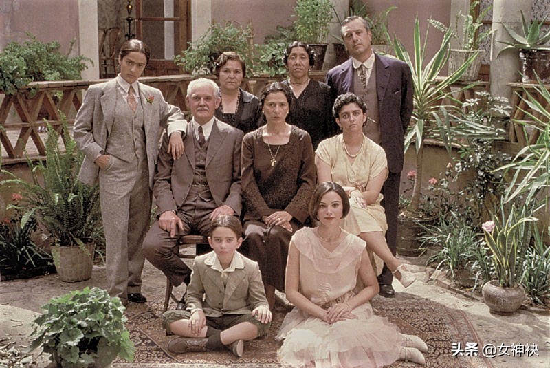 摄影师父亲给全家拍合影,弗里达别出心裁地穿上西服三件套男装,胸前别上一朵红玫瑰。