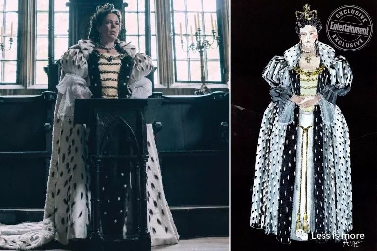 在黄金时代的背景下,伊丽莎白2的造型运用了更多挺拔的立领、轻柔的羽毛和华丽的刺绣元素,特别强调出v字腰线和立体感,比《绝代艳后》展现的法式宫廷风格更加硬朗。