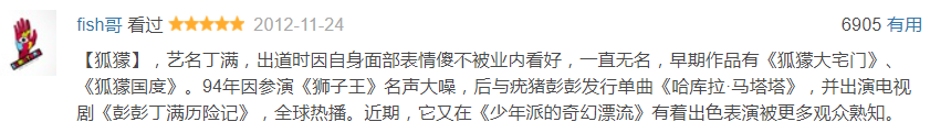 @fish哥:【狐獴】,艺名丁满,出道时因自身面部表情傻不被业内看好,一直无名,早期作品有《狐獴大宅门》、《狐獴国度》。94年因参演《狮子王》名声大噪,后与疣猪彭彭发行单曲《哈库拉·马塔塔》,并出演电视剧《彭彭丁满历险记》,全球热播。近期,它又在《少年派的奇幻漂流》有着出色表演被更多观众熟知。