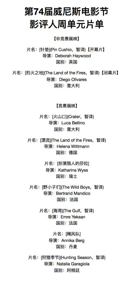本届“威尼斯日”单元入围名单如下: