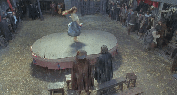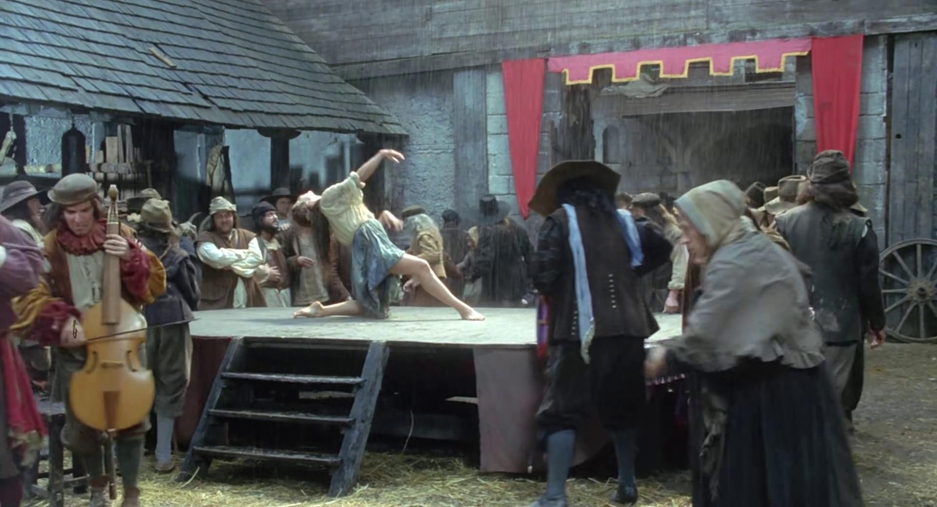 玛奇丝一出场,在男人的目光中旁若无人地跳舞,她像林间小鹿般轻盈,衣裙虽然土气脏乱,却完全不掩风华。玛奇丝也非常懂得男人的心理,眼含秋波、舞姿撩人。