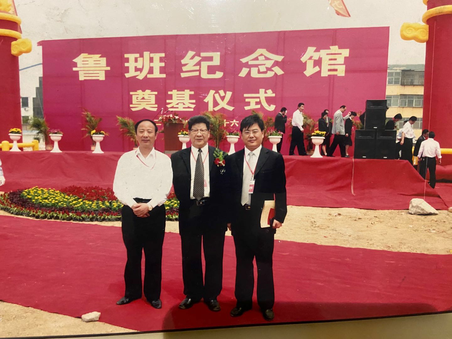 图为鲁班纪念馆奠基仪式王中先生(中)与任守景院长(左一,时任市墨子研究中心主任)马冀书记(右一,时任龙泉街道党委书记)合影