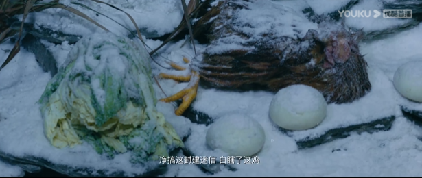 眼前的雪堆里埋着一只鸡和许多贡品。