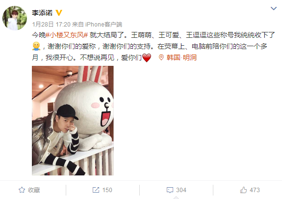 收官当晚,李添诺深情发文感谢粉丝一个月来的陪伴和支持,并配上一张帅照比心?