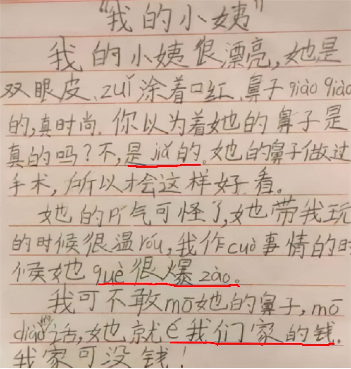 近期,一位小学生写人的作文《我的小姨》爆红网络,网友看了在捧腹大笑的同时,也忍不住调侃道,这样的作文什么都好,就是有点“费小姨”。