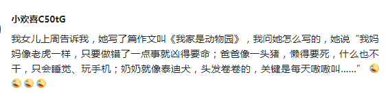 这样的想象也不是个例,就曾有一位网友在网上留言说,他家小学生从动物园角度对家人进行了描写,也是特色突出,读起来忍俊不禁。